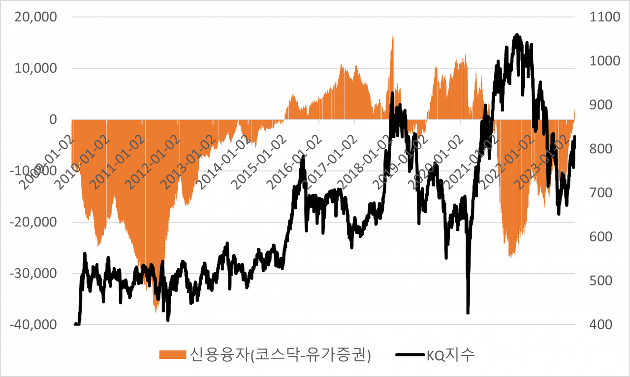 그리고 2023년 3월 다시금 코스닥 시장 신용융자 규모는 유가증권 시장의 신용융자 규모를 뛰어넘었습니다.