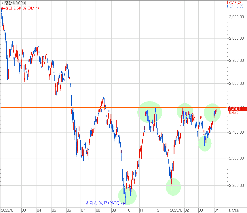 하지만 이후 시장은 반등하였고 11월과 12월 초 2,500p 부근까지 상승하면서 재기를 꿈꿨습니다만, 시장 체력은 아쉬웠고 12월 급락세가 발생하면서 다시금 주가지수 2,200p 테스트가 진행되었습니다. 그리고 올해 1월 말~2월 초 두 번째 주가지수 2,500p 돌파 시도가 감행되었었지요. 안타깝게도 3월 FOMC 우려 등으로 인하여 다시 조정세로 들어간 주식시장은 잠시 주가지수 2,500p에서 멀어졌습니다. 다만, 너무 멀어지지 않고 적당한 숨 고르기 정도였습니다.