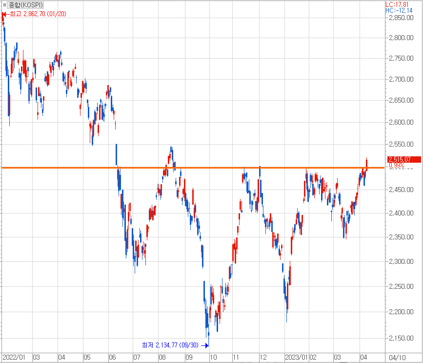 [ 4월 10일 월요일 아침, 코스피 지수는 2,500p를 수개월 만에 다시 돌파하였다. ]