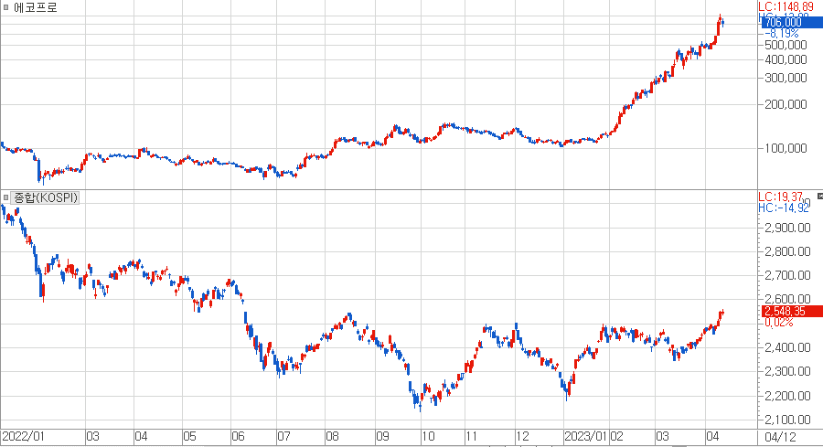 [ 에코프로와 코스피 종합지수의 2022년 1월 이후 흐름 ]