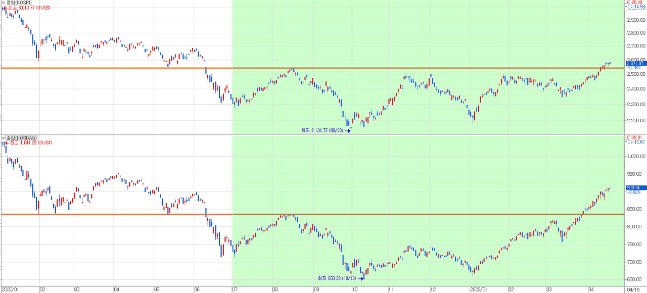 여러분들 혹시 작년 가을 기억나실지요? 미국의 자이언트 스텝 기준금리 인상이 연이어지면서 불안감이 높아지고 있던 가운데, 한국은 금융위기에 빠질 듯한 심각한 채권시장 불안이 발생하였었습니다. 결국 작년 가을 급락장이 발생하면서 코스피 종합주가지수는 2,134p까지 하락하였었고, 코스닥 지수는 650p까지 급락하면서 제2의 금융위기 분위기가 만들어졌습니다.