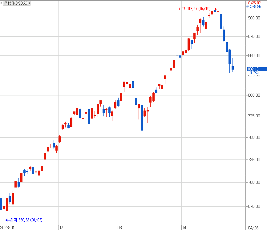 [ 코스닥 지수는 단 5거래일 만에 4월 상승분 모두를 반납시켰다. ]