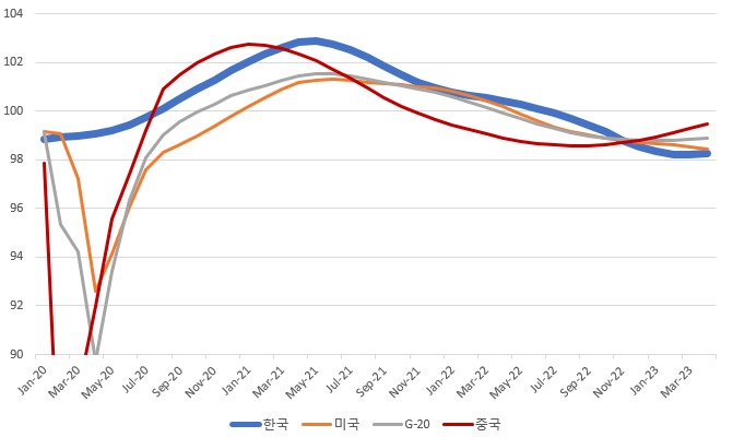 그리고 작년 2022년 10월 중국의 CLI가 가장 먼저 상승 전환을 하였고 이번에 2023년 4월 기준으로 한국의 CLI 또한 잠정적이지만 돌아섰습니다.