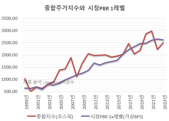 [ 코스피 지수와 시장 PBR 1레벨. 자료 분석 : lovefund이성수, 원자료 : KRX ]