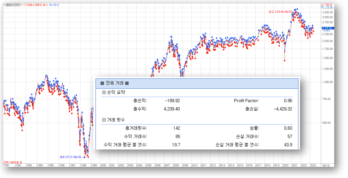 사례를 들기 위하여, 과매도권에서 매수하고 과매수권에서 매도하는 'CCI과매수 과매도' 전략을 1990년대 중반부터 현재까지의 종합주가지수에 적용하여 보았습니다.
