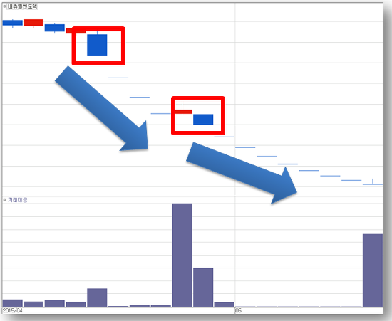 하한가가 아슬아슬하게 벗겨질 것으로 예상하고 매수세에 가담한 물량들이 다음날 N모회사는 점 하한가를 이어가면서 손절매조차도 못 하는 지경에 이르렀습니다. 한참 시간이 지난 후인 2015년 4월이 되어서야 하한가가 풀렸습니다만, 다시 한번 하한가에서 급반등을 노리고 들어온 매수세는 더 힘든 7거래일 연속 점하한가를 만들게 됩니다.