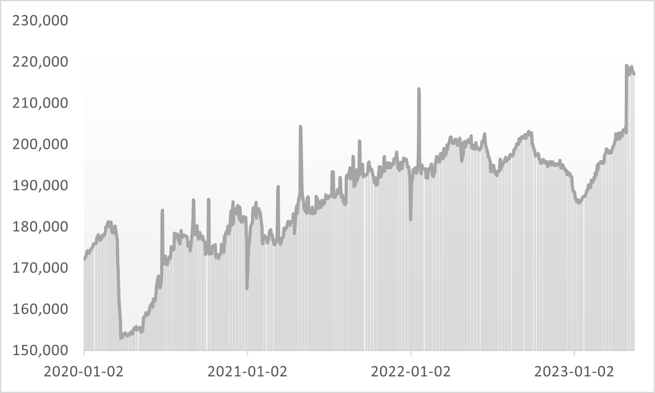 위의 표는 2020년 이후 최근까지의 예탁증권담보융자(주식담보대출) 규모를 보여주고 있습니다. 대략 10조 원대 중후반에서 천천히 완만하게 증가하였다는 것을 확인할 수 있습니다. 그런데 4월 말을 기점으로 예탁증권담보융자 규모는 거의 2조 원 가까이 폭증합니다. 아이러니하게도 빚투 규모의 척도인 신용융자는 이 시점부터 비슷한 규모로 감소하였습니다.