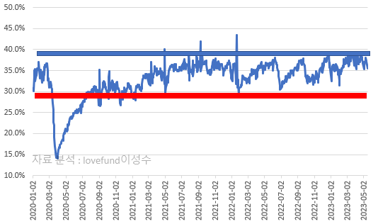 만약 3년 전 즈음처럼 예탁금 대비 신용융자 비율이 30% 초입 또는 그 미만으로 내려와 있다면 신용융자에 따른 잠재적 부담이 안정권에 들어왔다고 이야기해 드리겠습니다만, 4월 중순 경계치 39%까지 올라갔던 예탁금 대비 신용융자 비율은 이제 겨우 35% 선에 진입한 정도에 불과합니다. 긴장감 최고조에서 줄어들긴 하였지만 아직은 빚투 자금 수준은 긴장감을 놓을 수 없는 수준이지요.
