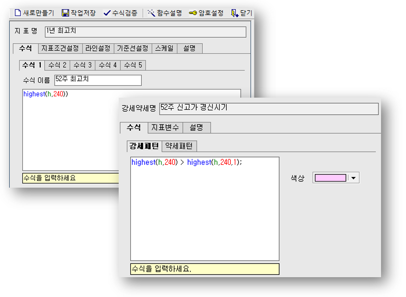 대부분의 증권사 HTS차트에는 ‘수식관리자’라는 기능이 있어 간단한 스크립트를 이용하여 자신만의 기술적 지표나 여러 가지 참고 지표를 만들 수 있습니다. 그 수식관리자를 이용해 기술적 지표와 강세약세 지표를 만들어 보았습니다.