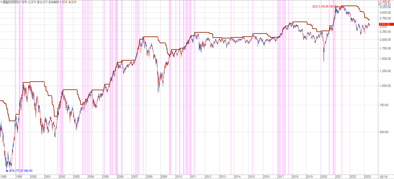 위의 차트는 1998년 이후 사반세기 동안 코스피 지수와 52주 신고점 그리고 52주 신고점이 경신되는 시점을 보조 지표로 표시한 자료입니다. 자료에서 핑크색으로 보이는 부분이 바로 주가지수가 직전 52주 신고가를 돌파하면서 신고점이 경신된 시점이라 할 수 있겠습니다. 특히 52주 신고점 경신이 군집을 만들 때 분홍색은 매우 강하게 나타납니다. 그 시기는 마치 캠프파이어에 기름을 부은 듯 뜨거운 느낌을 받게 합니다. 그만큼 핑크가 짙은 군집을 만들었을 때 더 강한 군중심리가 만들어졌던 것이지요.