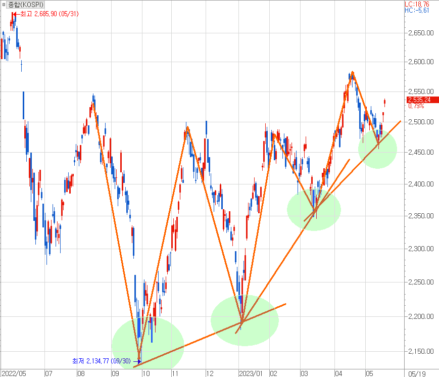 올해 연초부터 1분기 사이 증시 토크를 통해 가끔 주가지수가 쌍 바닥 또는 다중 바닥을 만들고 있는 게 그 형태가 최근 저점이 올라가는 짝궁둥이 패턴이 만들어진다는 설명해 드리곤 하였습니다.