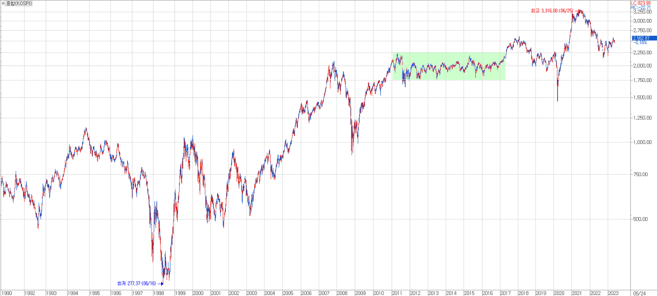 투자자들의 마음과 달리 주식시장이 화끈하게 상승하지 못하다 보니, 현재 증시가 답답하시리라 생각됩니다. 그런데 이런 증시 상황이 자칫 2010년대 증시와 같은 꽉 막힌 장기 횡보장의 시작점이라고 가정한다면 어떤 생각이 드시나요? 상상만 해도 고구마 100개를 물 없이 먹은 듯 답답함이 느껴지실 것입니다.