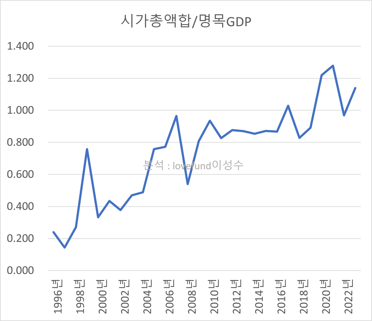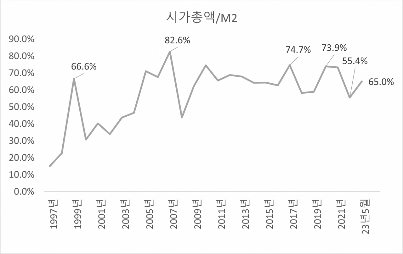 [ M2 대비 시가총액 비율 추이. 원자료 : 한국은행/KRX, 분석 : lovefund이성수 ]