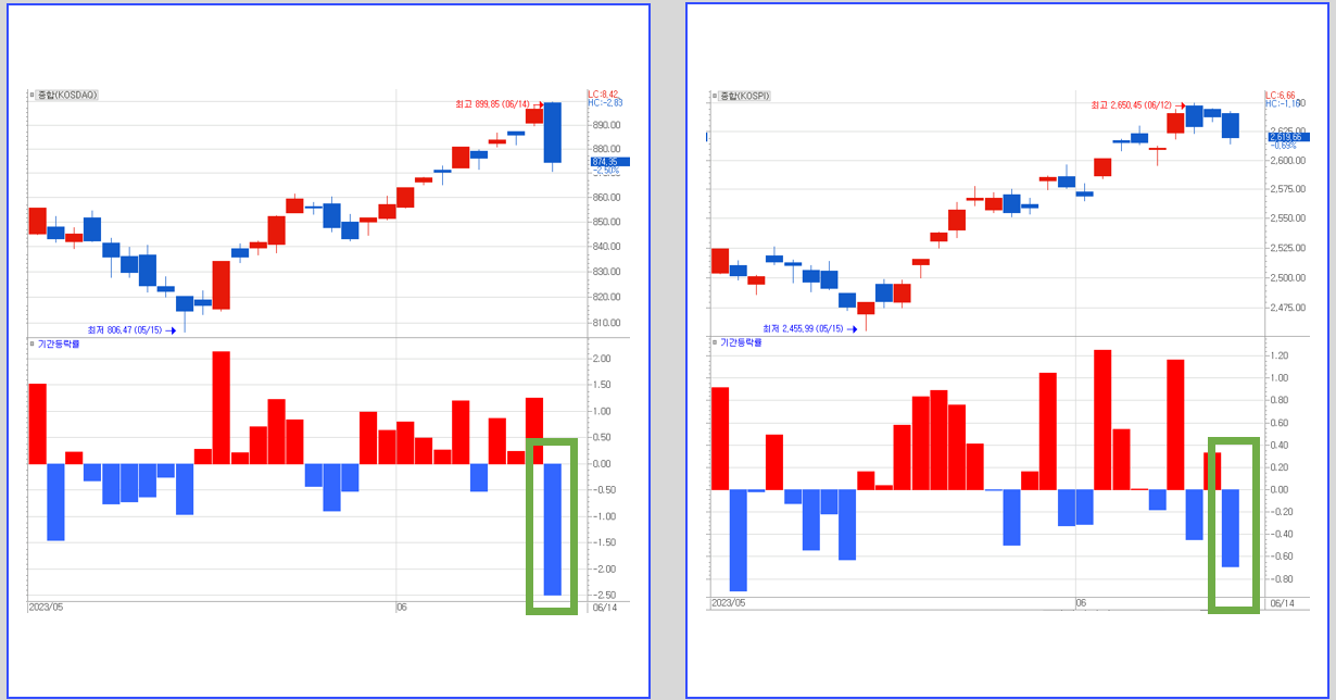 [ 6월 14일 장중 발생한 증시 낙폭은 5월 초 이후 최대 낙폭을 기록하다 (좌:코스닥, 우:코스피) ]