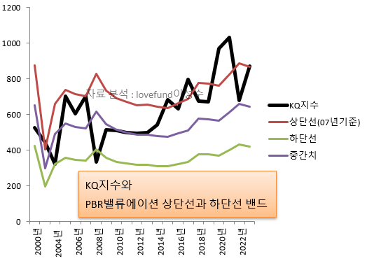 [ 2000년 이후 코스닥 지수와 PBR 밴드 추이. 원자료 : KRX / 분석 : lovefund이성수 ]