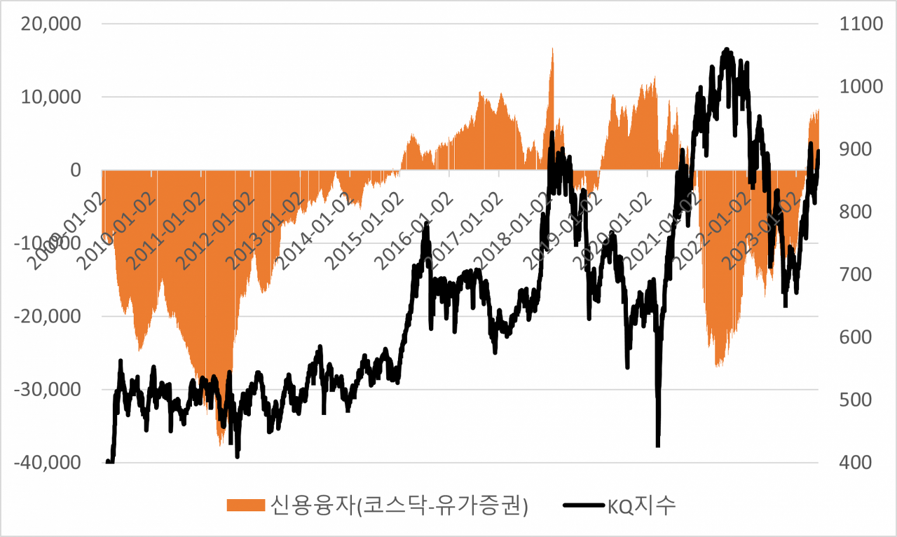 예를 들어 2010년대 초반까지 차화정 중심의 코스피 시장 강세 속에 코스피 시장의 신용융자가 급증한 후 수년 동안 코스피 지수는 제자리걸음만 걷는 동안 2010년대 중후반까지 코스닥 시장은 코스피 대비 상대적으로 강한 흐름이 나타났었습니다.