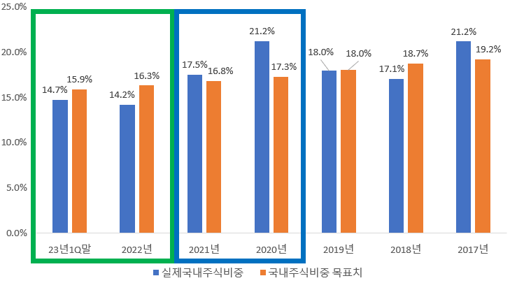 위의 표는 앞서 언급 드린 상황을 보여주고 있습니다. 2020년은 실제 국내 주식 비중이 목표치보다 높아졌지만, 그 높아진 비중을 낮추기 위해 폭탄 매물을 쏟아내는 액션이 있었습니다. 하지만 2022년과 2023년 1분기 말에는 목표치에 제법 크게 미달하는 국내 주식 비중 목표치이지만 매수세는 전혀 나타나지 않고 있습니다.