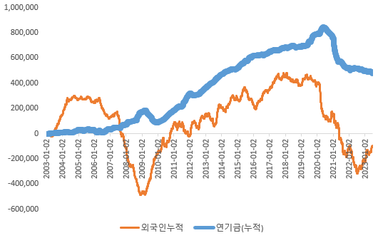 최근 3년여 거의 매일 연기금이 매도세로 일관하다 보니 연기금은 매도만 하는 기관으로 각인되고 있습니다. 하지만 2010년대까지만 하더라도 연기금 수급은 한국 증시를 지키는 든든한 언덕이었습니다. 위의 자료는 2003년 이후 최근까지의 연기금과 외국인의 누적 순 매매 추이를 보여주고 있습니다.