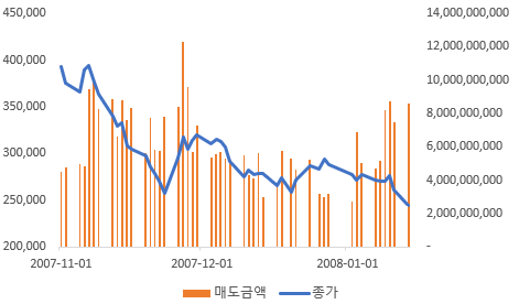이렇게 매도를 이어가다 보니 2008년 1월 14일이 되어서야 모든 주식을 매도할 수 있었습니다. 총매도 금액은 거의 석 달여 동안 2007년 11월 첫날 계산한 4천억 원이 아닌 3천억 원 수준. 그 사이 주가가 하락하였기 때문입니다.