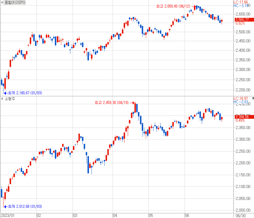 올해 상반기 증시의 특징이라 한다면 에코프로, 에코프로비엠 등의 이차전지 관련주들의 화려한 랠리가 코스닥 지수를 중심으로 주요 지수를 끌어올리면서 차별화 장세를 만들었단 점입니다. 그 열기는 어마어마하였습니다. 그리고 코스피 시장에서는 워낙 무거웠기에 움직이지 않던 삼성전자, SK하이닉스, 현대차, 기아, POSCO홀딩스 등과 같은 시가총액 최상위 종목들이 40% 전후의 강한 상승률을 만들면서 코스피 지수를 끌어올렸고 주가지수 두 자릿수 상승률을 만드는 원동력이 되었습니다.