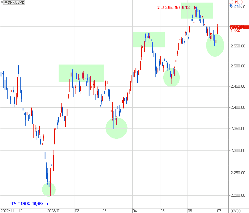그러다 보니 주식시장이 상승하려 하면 살짝 주저앉고, 그렇다고 하여 푹 주저앉는 것이 아니라 적절한 수준에서 다시 바닥을 잡고 다시 상승하다가 고점만 뚫고 다시 살짝 내려앉는 패턴이 올해 반복되고 있습니다.