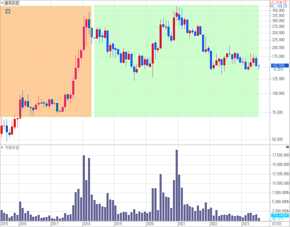 2018년 셀트리온 코스피 이전을 먼저 복기 해 보겠습니다. 셀트리온의 경우 그 이전 2017년부터 주주들과 시장 참여자들의 관심을 받으면서 주가가 단숨에 3~4배씩 상승하였습니다. 그 당시 분위기는 코스피 넘어가면 더 높은 고지로 달려간다는 분위기였습니다.
