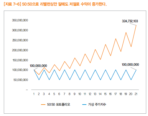 [ 50vs50 전략에서 발생하는 섀넌의 도깨비 현상, 자료 참조 : 가치투자 처음공부(이성수 저)]