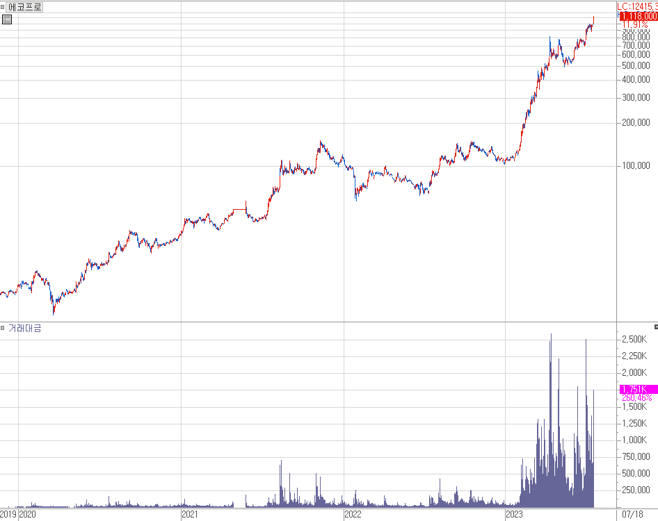 [ 2020년 3월 최저점 이후 100배 이상 상승한 에코프로 ]