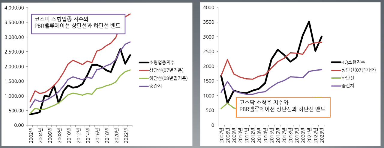 [ 코스피 소형주 PBR 밴들(좌축)과 코스닥 소형주 PBR 밴드(우측) ]