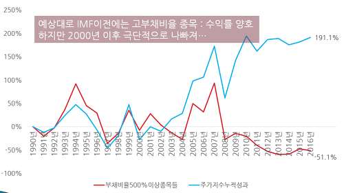 1990년 말부터 2016년 말까지 부채비율 500% 이상인 종목들을 매년 연말 종목을 골라 투자하고 1년 뒤 다시 종목을 재편성하는 작업을 반복하면서 수익률을 추적하여보았습니다.
