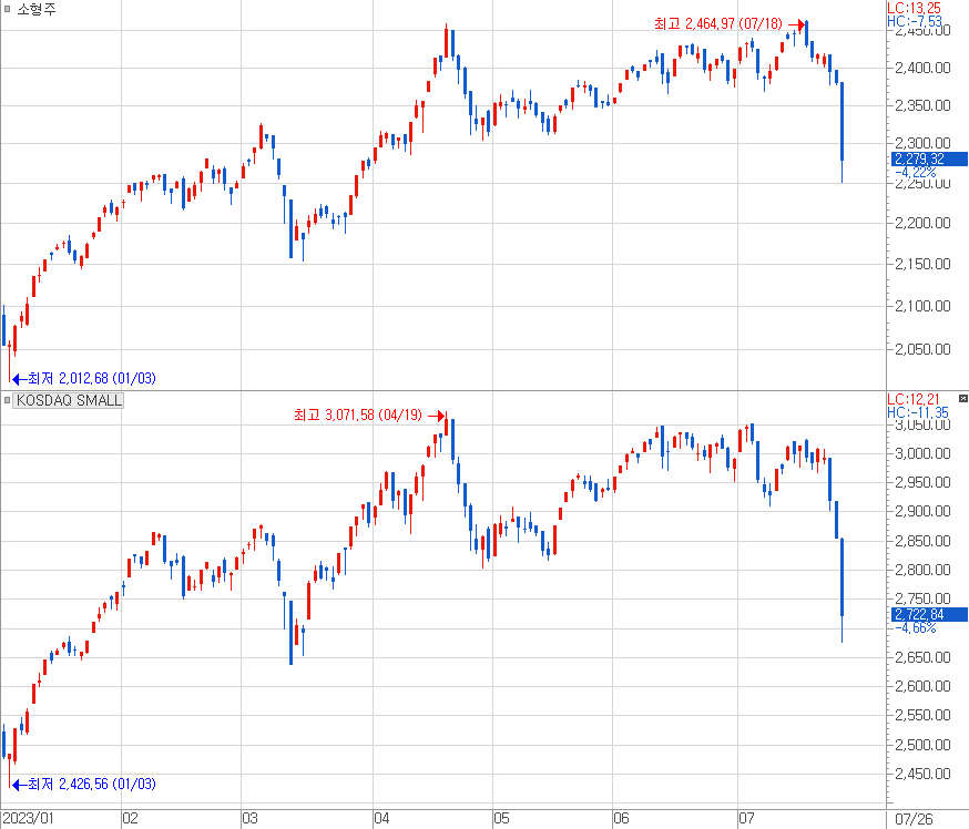 이번 주 월요일부터 코스피와 코스닥 양 시장에서의 스몰캡 낙폭은 폭락 수준으로 강력하였습니다. 대내외적인 심각한 악재가 없었음에도 주요 스몰캡 지수는 월요일부터 수요일까지 단 3일 만에 거의 –10% 가까운 하락률을 기록하고 말았습니다. 막연히 에코프로 등 이차전지 관련주를 사기 위한 투자자들이 다른 종목을 매도하였기 때문이라 생각됩니다만, 과연 스몰캡에 누가 짱돌 매물을 던진 것일까요?
