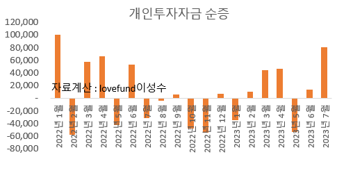 이를 합친 7월 개인 투자자금 순증 규모는 8조원이 넘었을 정도이니 2022년 1월 이후 1년 반 만에 가장 큰 규모의 개인 투자자금 순증(예탁금증감+개인 순매수)이 발생하였습니다.