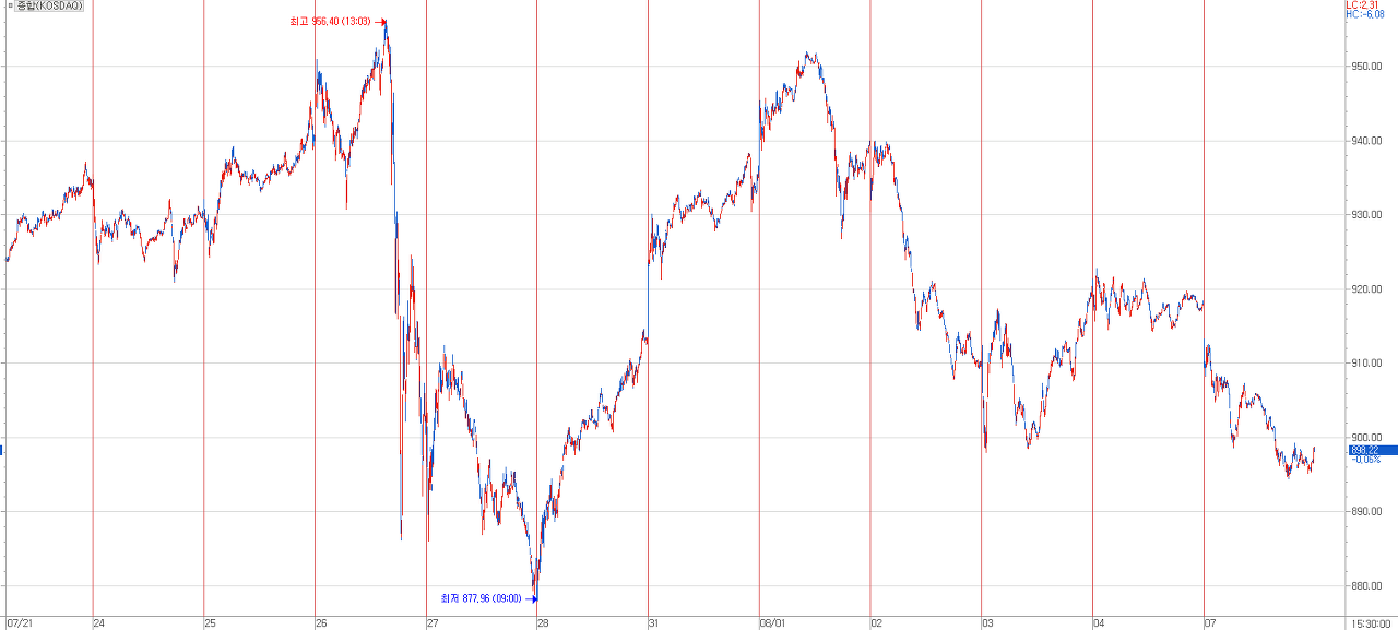 [ 7월 말 이후 최근까지 급격한 변동성 속에 코스닥 지수 분봉 추이 ]