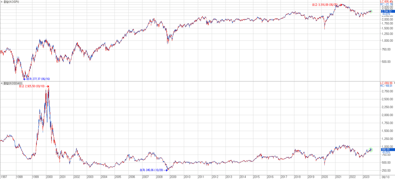 [ 1997년 이후의 코스피 지수와 코스닥 지수 추이. 최근 증시는 작은 점에 불과하다 ]