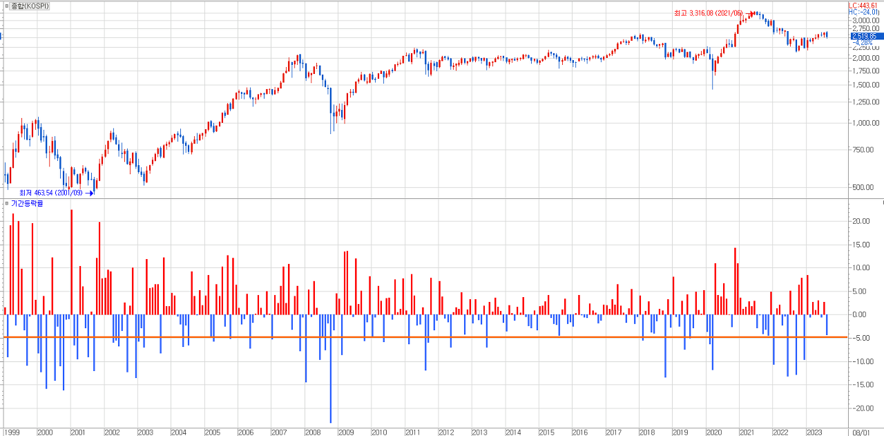위의 자료는 1999년부터 2023년까지의 코스피 월봉 차트와 월간 등락률 지표를 보여주고 있습니다. 여기에 –5% 하락률을 가로선으로 표시하여 보았습니다. 보시더라도 –5% 수준의 지수 하락률은 흔하게 발생하는 현상이고, 2003년~2007년과 같은 상승장 때도 자주 나타났었음을 확인할 수 있습니다.