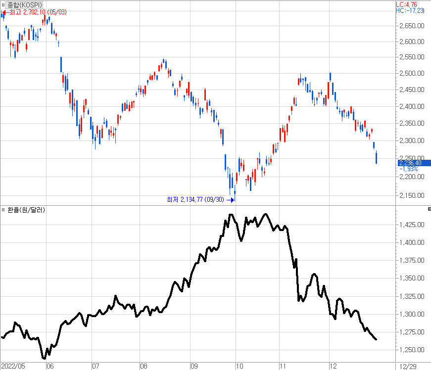 [ 작년 가을 금융시장 혼란 속에 증시 급락도 동시에 발생했다. (상단:코스피/하단:원달러) ]