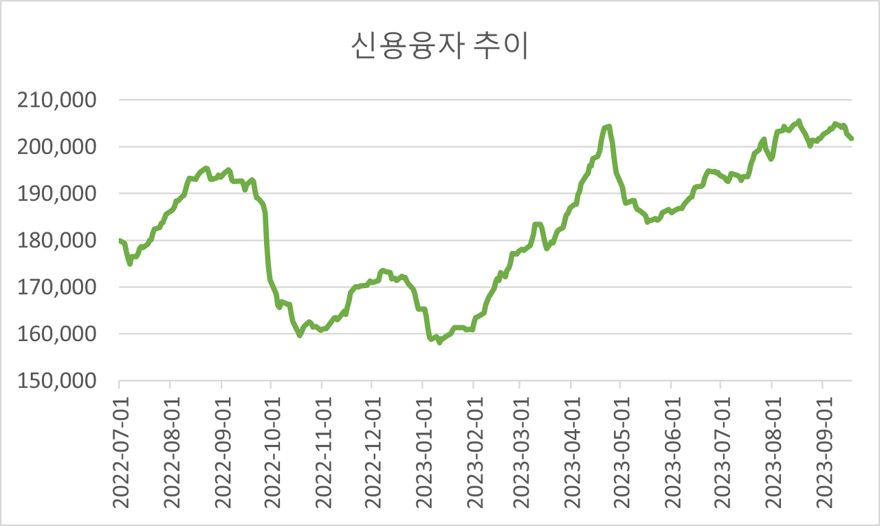 [ 신용융자 잔액 추이 2022년 하반기부터 2023년 9월 최근까지. 자료 참조 : 금융투자협회 ]