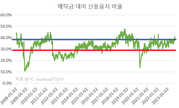 [ 예탁금 대비 신용융자 비율 추이. 분석 : lovefund이성수 / 원자료 참조 : 금융투자협회 ]