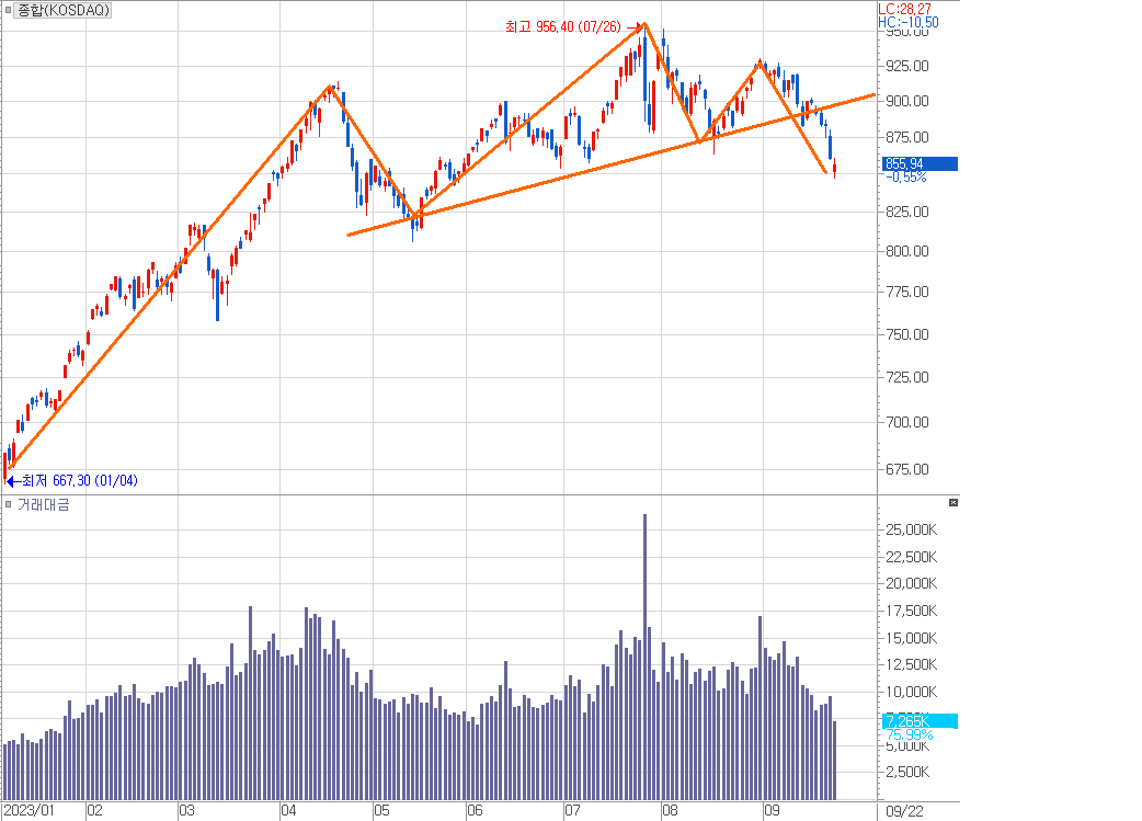 미국 연준의 매파적 스탠스가 9월 FOMC에서 더욱 강해졌다는 것이 명분입니다만, 한편 올해 주식시장이 강했다는 점, 특히 코스닥 시장이 매우 강했다 보니 차익실현 매물이 늘어나고, 신규 자금이 주춤하면서 코스피 시장보다 어깨가 더 무거워졌던 것입니다.