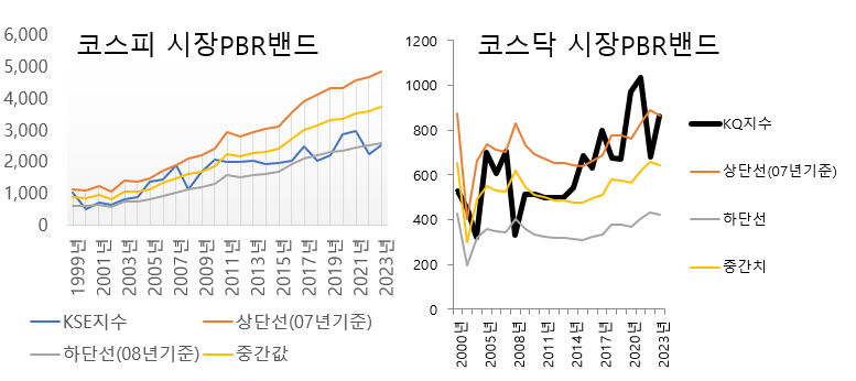 위의 차트는 코스피(좌)와 코스닥(우)의 시장 PBR 밴드를 필자가 계산하여 그려본 자료입니다. 코스피 시장은 현재 지수대가 하단밴드까지 밀려 내려온 저평가된 영역으로 해석해볼 여지가 강합니다. 하지만 코스닥 시장의 경우는 PBR 밴드 상단부에서 움직이고 있다 보니 저평가보다는 가격 부담이 큰 위치에 있는 것이지요.