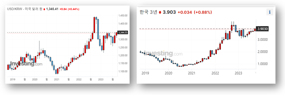 [ 최근 다시 앙등하고 있는 달러 환율과 시장금리. 자료 참조 : 인베스팅 ]