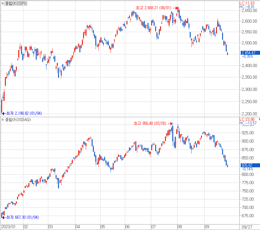 추석 연휴를 하루 앞둔 오늘 주식시장은 방향을 잡지 못하는 듯 눈치 보는 분위기입니다. 어찌 보면 9월 하락장을 마감하고 바닥을 잡아줄 것 같기도 하지만 다른 관점에서 보면 하락추세로 굳어진 듯 보이다 보니 추석 연휴를 앞두고 개인 투자자의 마음을 불안하게 하고 있습니다.