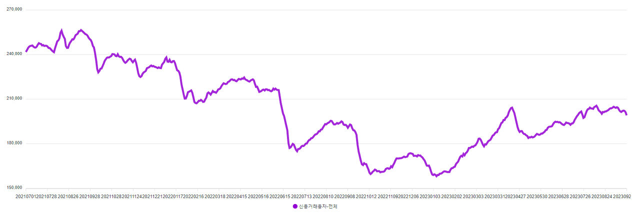 [ 2021년 하반기 이후 신용융자 잔고 추이. 자료 참조 : 금융투자협회 ]
