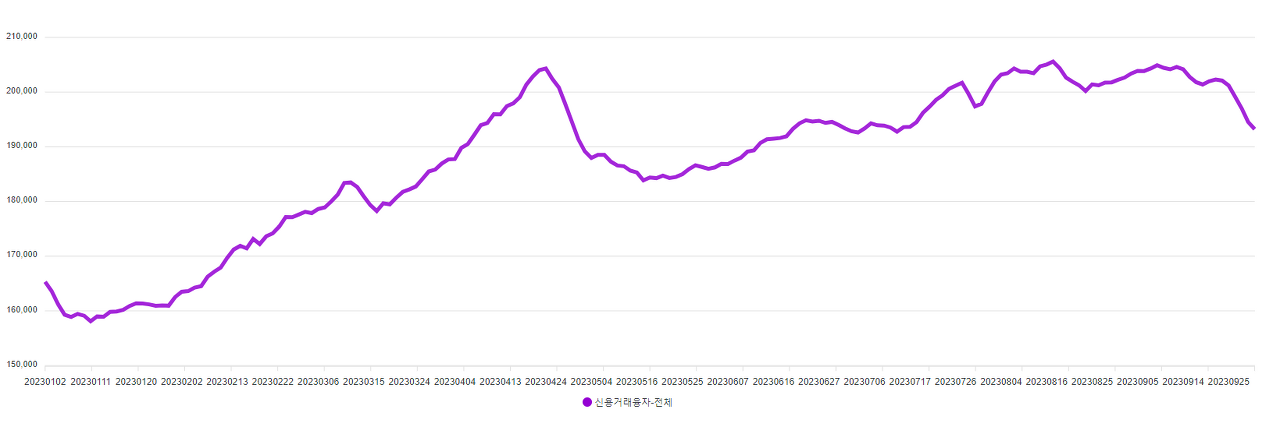 10월 5일(목) 기준 신용융자 잔액은 19조 3,220억 원으로 지난 9월 중순에 비하여 1조 원 이상 감소하긴 하였습니다. 여기에 이번 주 거래분까지 감안한다면 신용융자 잔고는 18조 원대 중후반까지 감소하였을 것으로 추정됩니다.