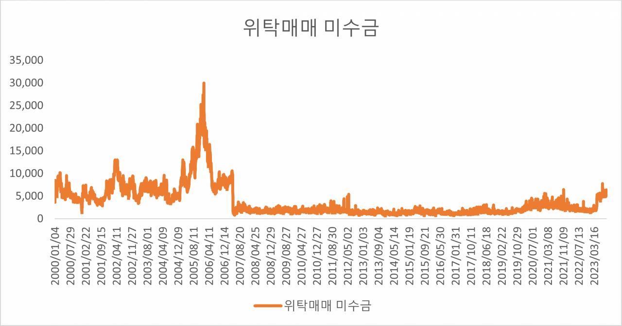 [ 2000년 이후 미수금 규모 추이. 자료 참조 : 금융투자협회 ]