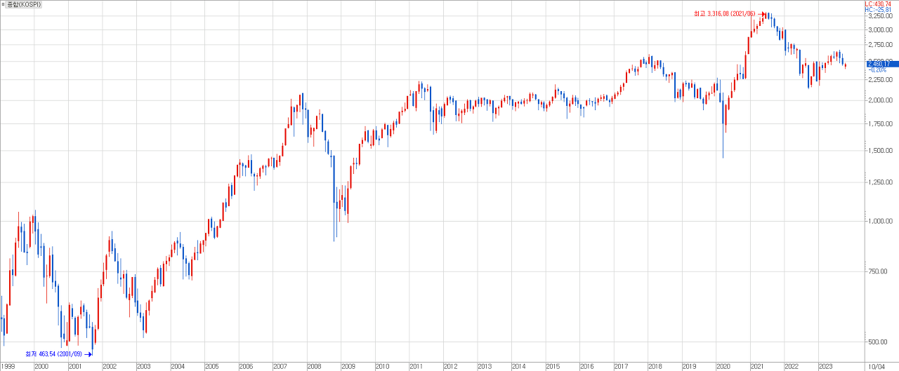 이른 새벽에 일어나 글로벌 증시를 살펴보다가 문득, 제가 주식투자를 시작했던 이후 현재까지의 증시를 되돌아보았습니다. 1999년 연초 이후 2023년 현재까지 25년여의 세월을 뒤돌아보다 보니 주식시장은 그저 잡음 가득한 그래프로만 그려질 뿐이었습니다.