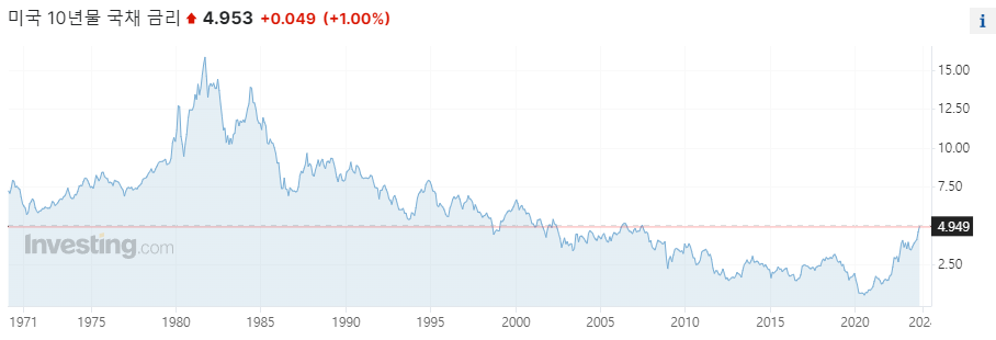 어젯밤에도 미국 10년 국채 금리는 16년 내 최고치를 경신하면서 4.9% 선을 넘어섰습니다. 조금만 더 상승한다면 5% 선을 넘을 수도 있는 수준입니다. 이러한 시장 금리 상승은 한국 금융시장에서도 비슷하게 나타나고 있습니다. 한국 10년 국채 금리는 작년 가을 채권 대란 수준 때까지 상승하고 있으니 말입니다.