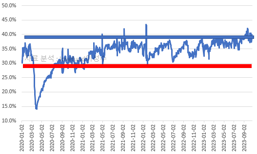 올해에는 지난 9월에 40%선을 처음으로 넘긴 이후 9차례 40%선을 넘긴 상황이 발생하였습니다. 그 이후 증시 조정이 찾아왔고 신용융자도 감소하였습니다. 신용융자가 감소하였다면 자연스럽게 예탁금 대비 신용융자 비율도 감소했어야만 합니다.