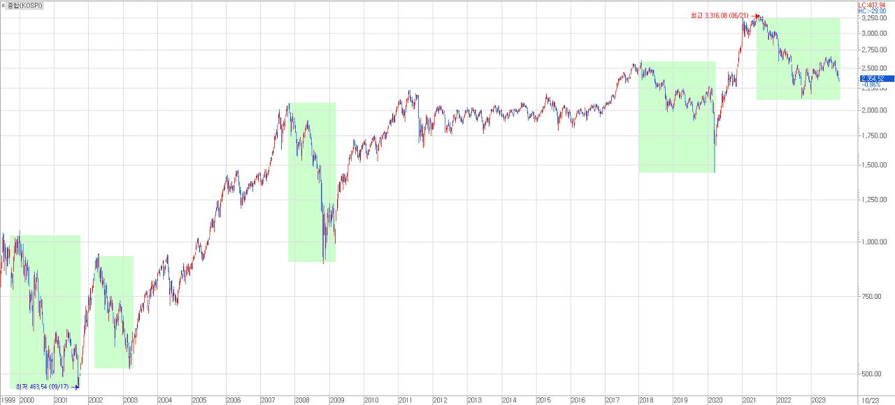 쇼크가 발생한 이후 2020년 하반기부터 시작된 강세장, 2009년 이후 상승장, 2000년대 초중반의 초장기 강세장에서 엄청난 수익을 만든 투자자들은 이런 대폭락 장에서 생존한 투자자들입니다.