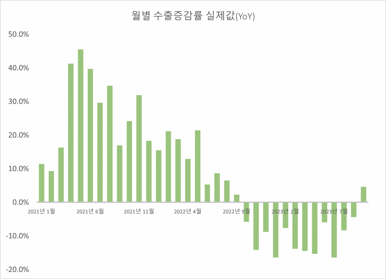 아래 표는 월별 수출증감률 전년동기비를 보여주고 있습니다. 2021년 봄 이후 수출 증가율 YoY가 감소하기 시작하다가, 2022년 10월에는 전년 대비 수출 증가율은 마이너스로 전환됩니다. 이후 만 1년여 수출 감소가 지속되었습니다.